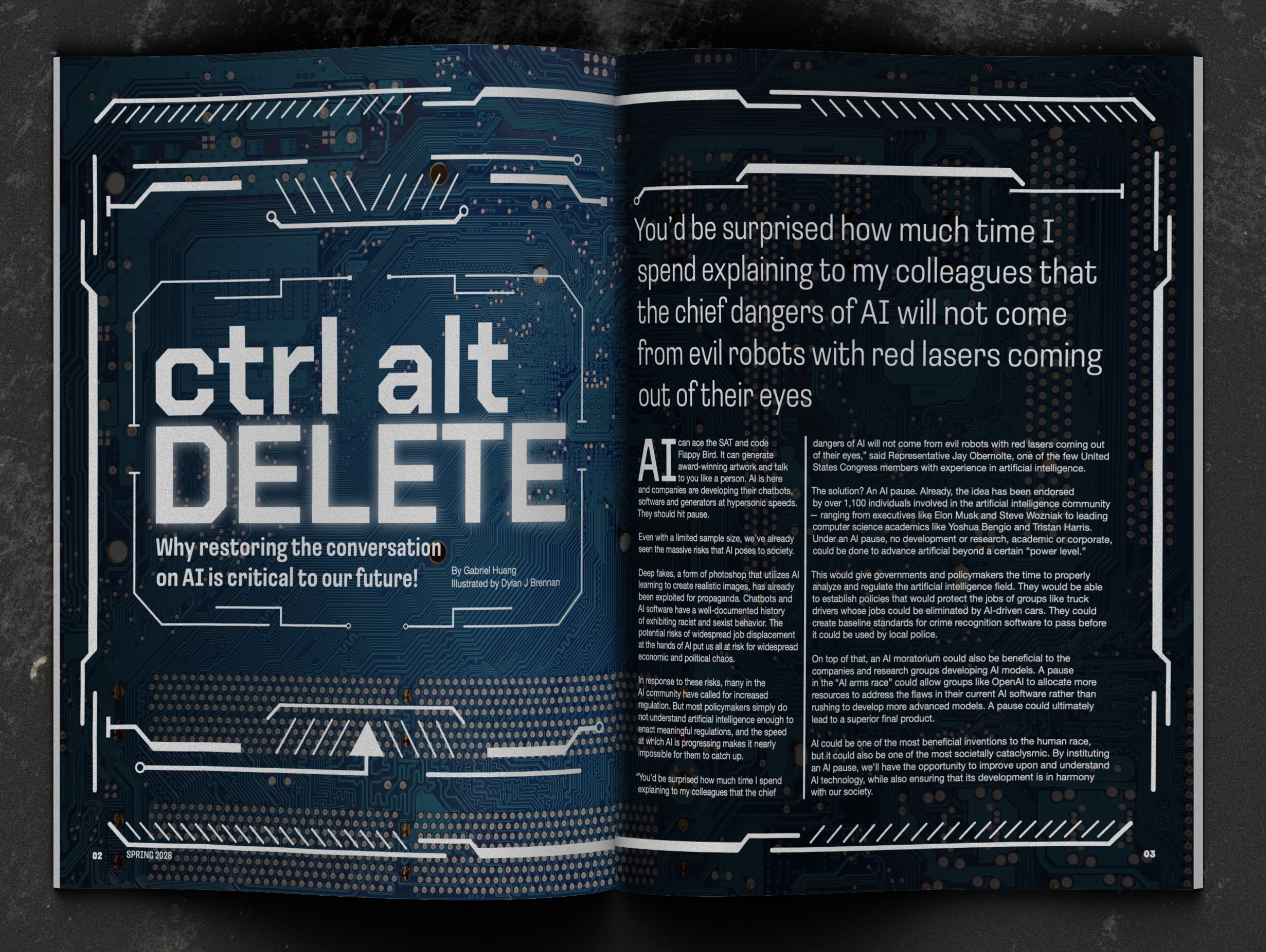 This project is a two-page magazine spread created from a student-written article about the need to restore meaningful conversation around artificial intelligence. The design uses a circuit-board visual theme, bold typography, and a structured editorial layout to reflect the technological subject matter. The goal was to support the article’s message through a clear, engaging, and visually cohesive spread that captures the urgency and relevance of the topic.