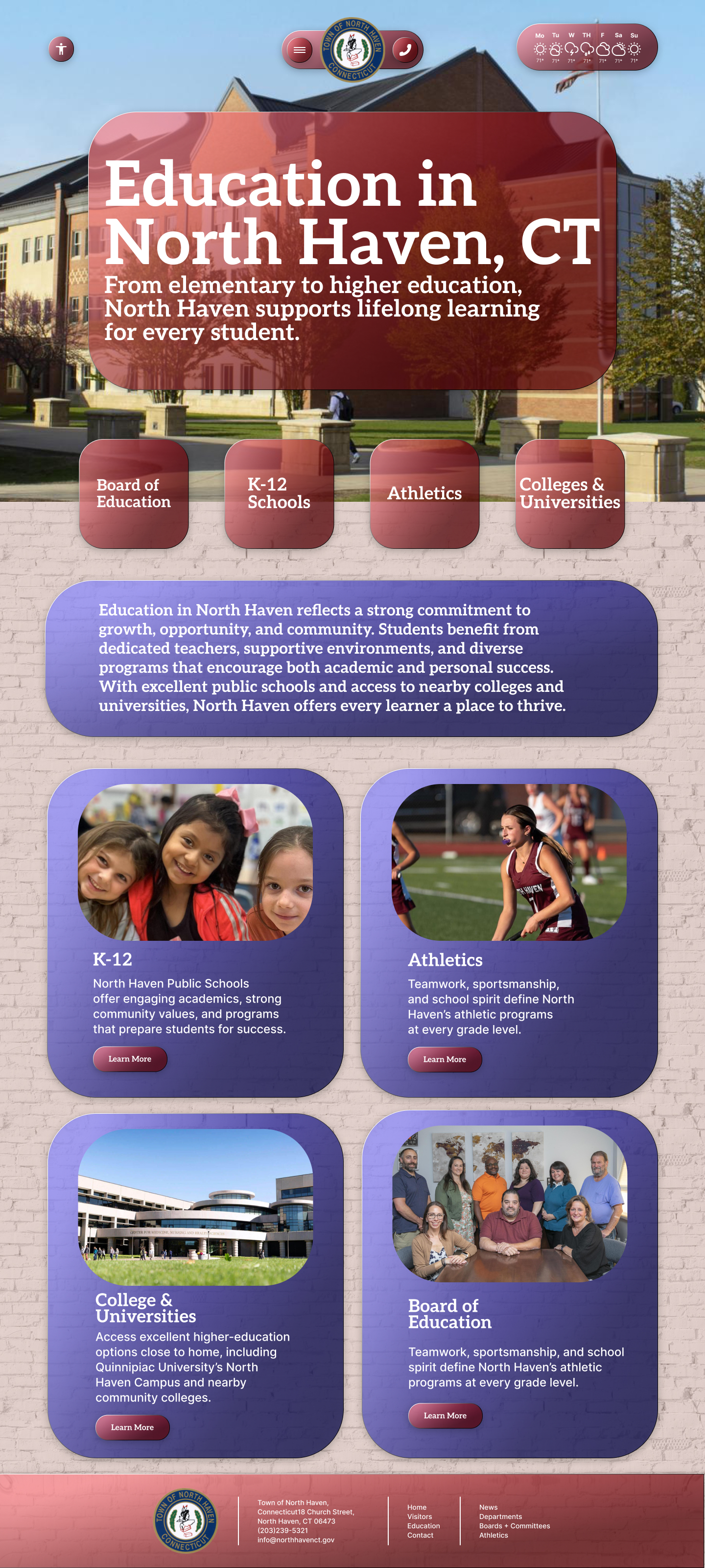 This project is a full redesign of the North Haven town website, created to improve usability while honoring the town’s small-town charm and historic character. The design incorporates a subtle, slightly dated aesthetic inspired by North Haven’s long-standing local heritage, giving the site a familiar, community-rooted feel. These example pages showcase the visual direction across events, parks, visitor information, and local business support. Rounded UI elements, warm tones, and textured backgrounds work together to create a cohesive experience that feels both approachable and reflective of the town’s history.
